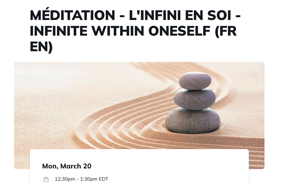 MSP SESSION 2 – INSTRUCTION PERSONNELLE L’instruction personnelle de la Méditation du Son Primordial est une occasion bien spéciale. Vous allez rencontrer individuellement votre instructrice de méditation pour recevoir votre mantra personnalisé et apprendre comment l’utiliser adéquatement et vous allez être invité à méditer par vous-même pour environ une demi-heure. Vous aurez à choisir une […]